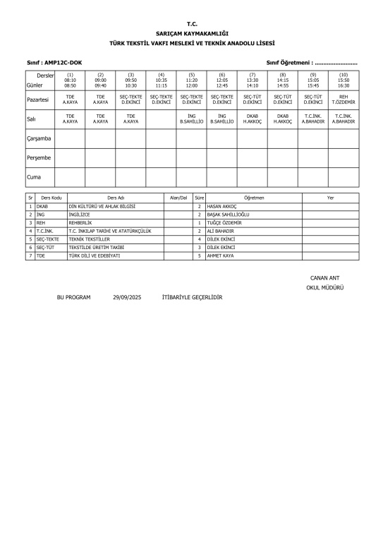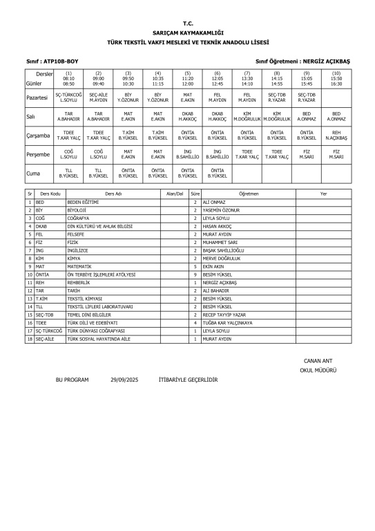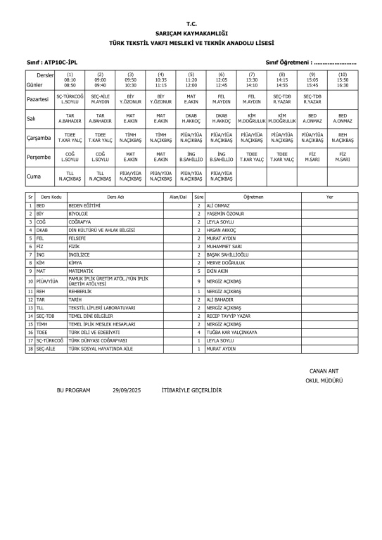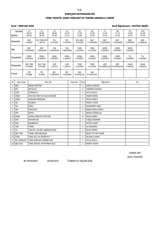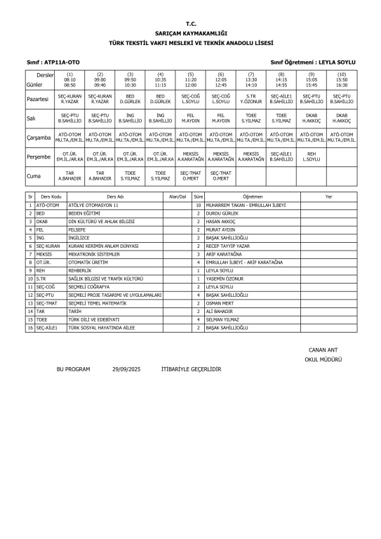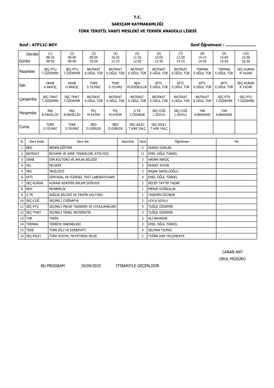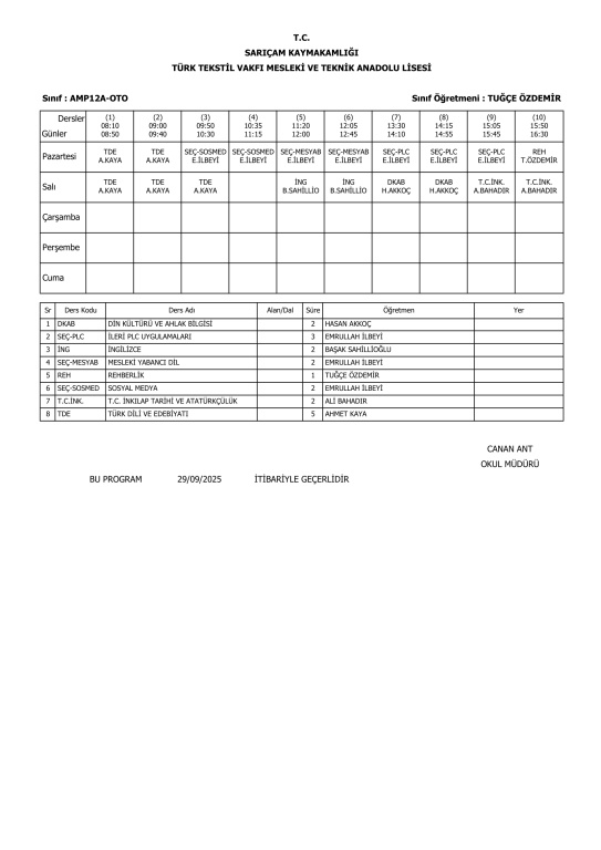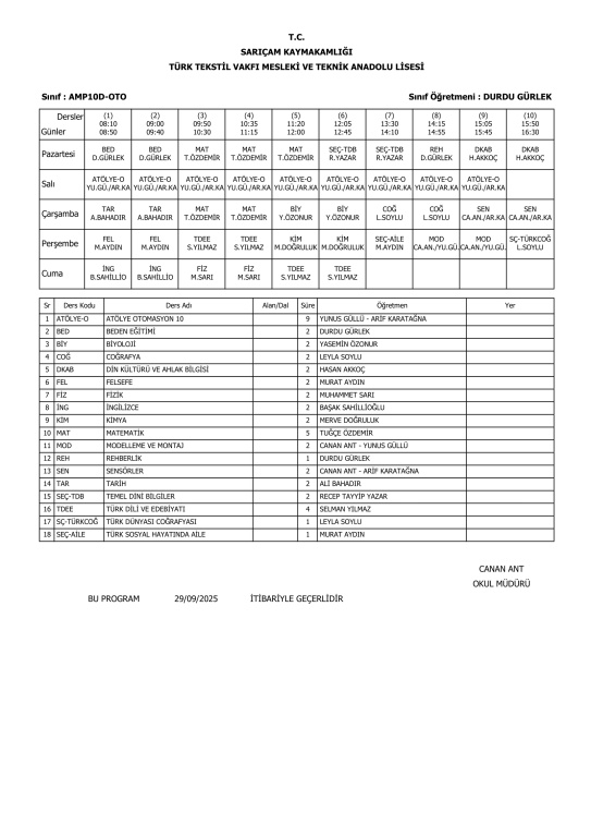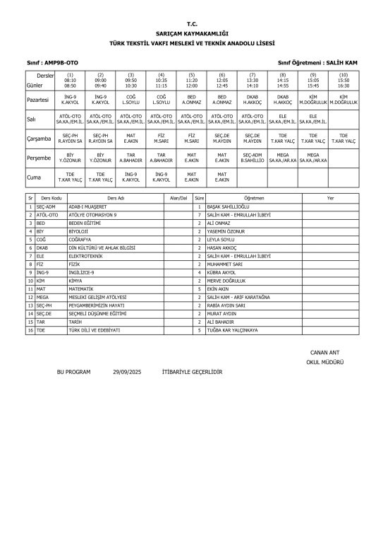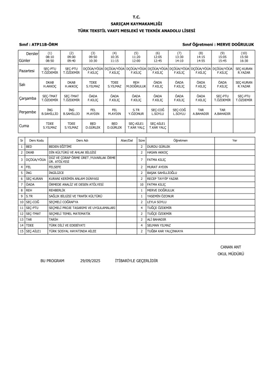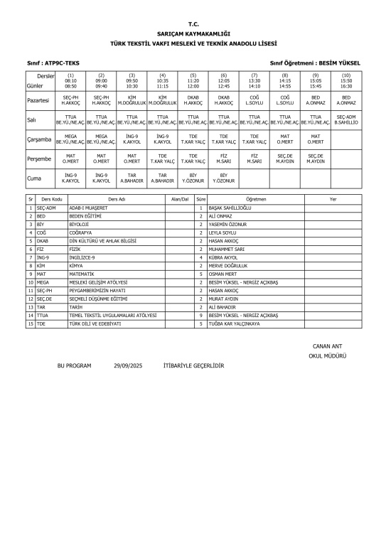 29 Eylül 2025 Pazartesi itibariyle geçerli ders programlarımız.